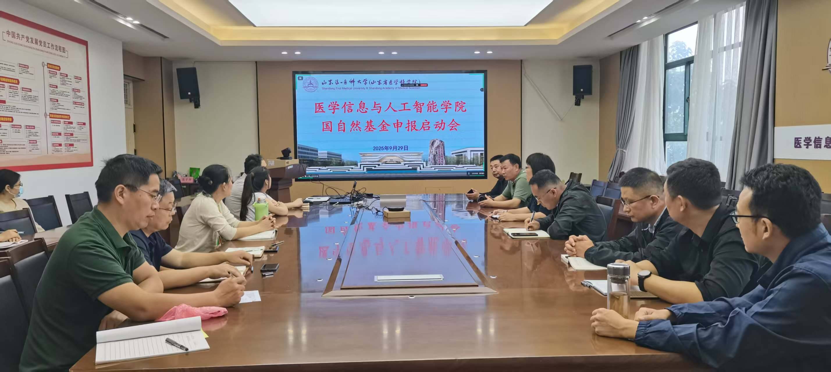 2025年9月29日上午,医学信息与人工智能学院在济南与泰安两校区同步召开国家自然科学基金项目申报启动会。学院党委书记王晓艳主持会议,全体教师参会。会议伊始,2025年度国家自然科学基金C类项目获得者巩立鑫博士与魏春阳博士先后作申报经验分享。巩立鑫...
